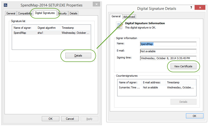Before posting our installation file, we always scan it for viruses, malware, etc. using the latest version of Symantec’s Antivirus Software and then we sign it with a digital signature so you can tell if something happens to it on the way to you. To check the status of the digital signature, you can RIGHT-mouse click on the SETUP.EXE file, select “Properties” from the menu, then click the [Digital Signatures] tab…